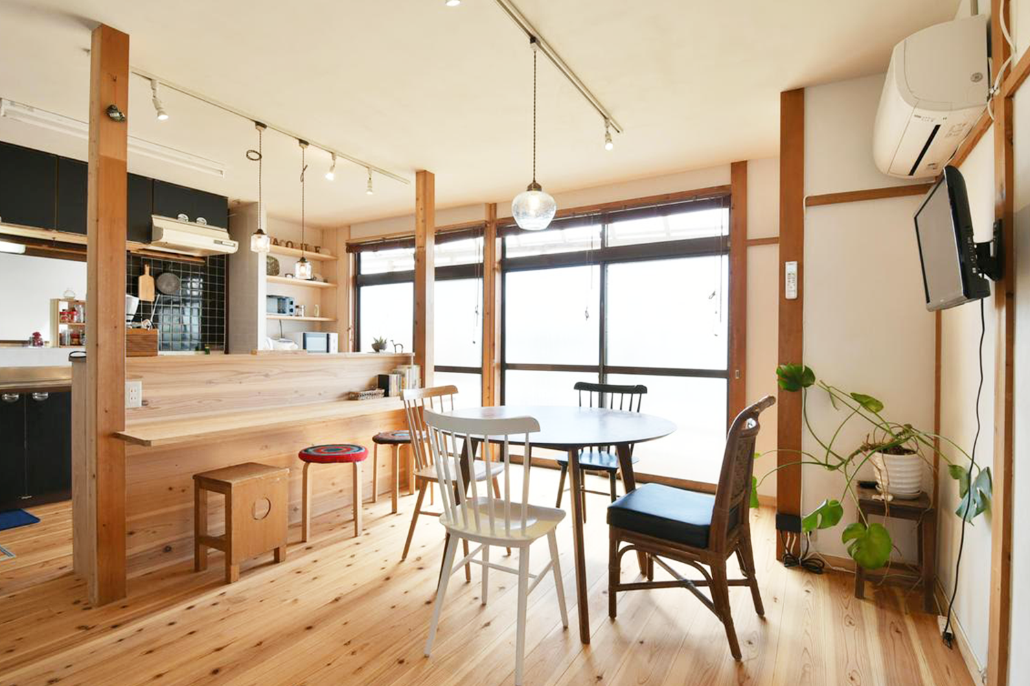 1階は共有スペース。無垢材と珪藻土でつくったキッチンダイニングでは、地元食材を味わい、入居者同士での情報交換の場としてご利用いただけます。